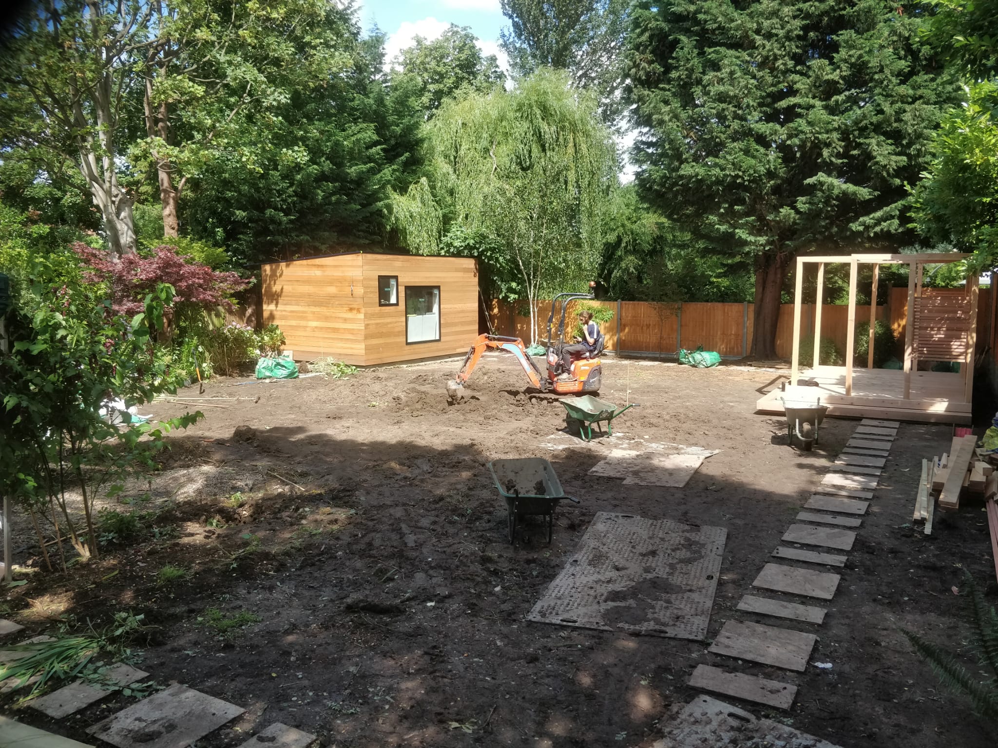 During this 4-week project we excavated lawn before re-turfing, adding an astro-turf area (for cricket) and planting flowers and trees.
